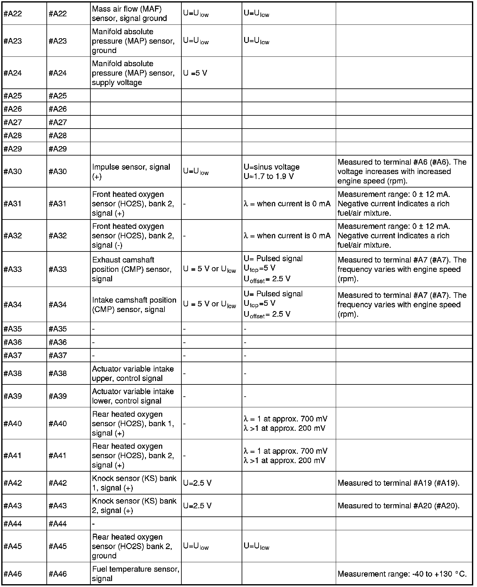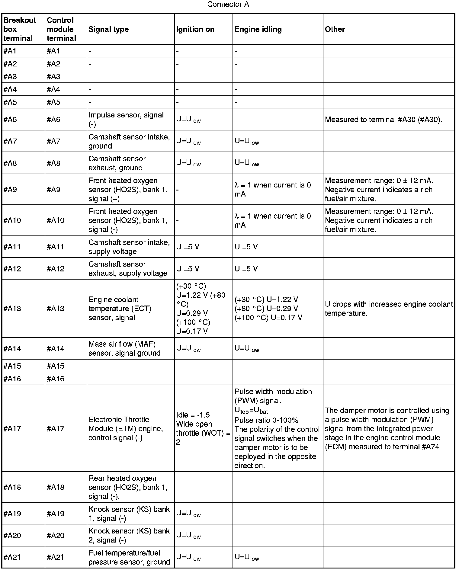 All values below are measured between the relevant terminal in column 2 and #Axx (#Axx on the breakout box) unless otherwise stated in parenthesis after the table entry.
