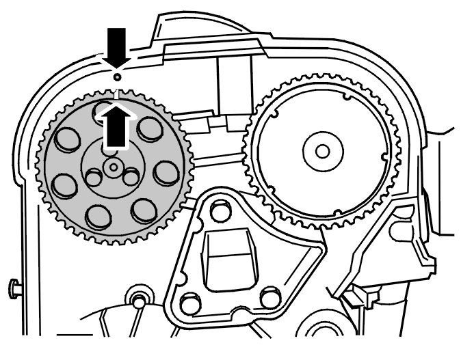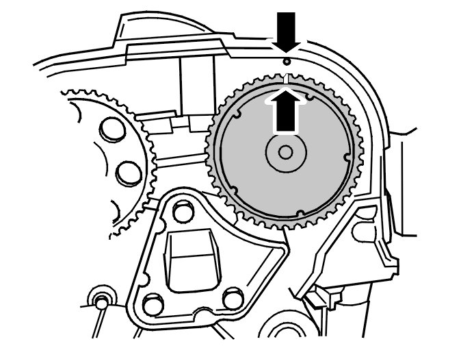 Turn the crankshaft clockwise until the markings on the crankshaft and the camshaft pulley correspond. The markings are illustrated.