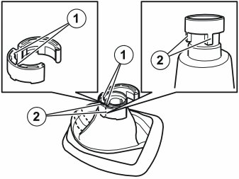 Note! The end of the clamp equipped with cut-outs must be turned towards the lower edge of the gear selector lever knob. The two vertical cut-outs (1) in the clamp must fit into the corresponding ridges (2) in the lower section of the knob.