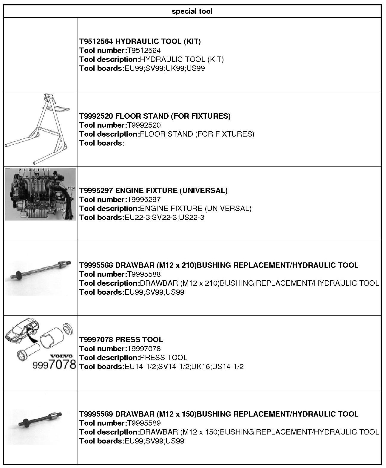 951 2564 Hydraulic tool 951 2564 Hydraulic Tool , 999 2520 FLOOR STAND 999 2520 Floor Stand , 999 5297 ENGINE FIXTURE 999 5297 Engine Fixture , 999 5588 Puller rod 999 5588 Puller Rod , 999 7078 Press tool 999 7078 Press Tool.
