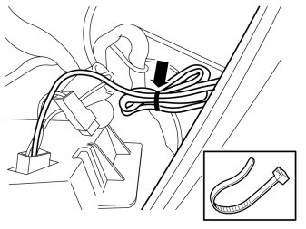 - Take hold of the long cable harness. Route the end with the small connector on the right-hand side in the center console, up and out through the hole for the loudspeaker grille/console loudspeaker grille.