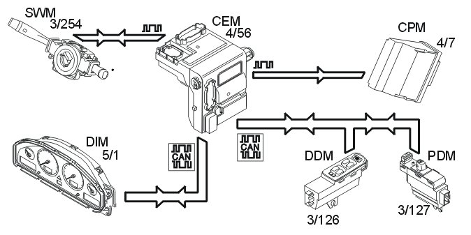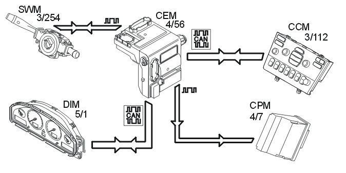 The central electronic module (CEM) (4/56) receives data about when the driver wants to drive from the control stalk module (steering wheel module (SWM)) (3/254) and the driver information module (DIM).
