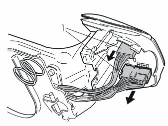 - Press in the catch (1) on the connectors for the left dummy button. Remove the connectors.