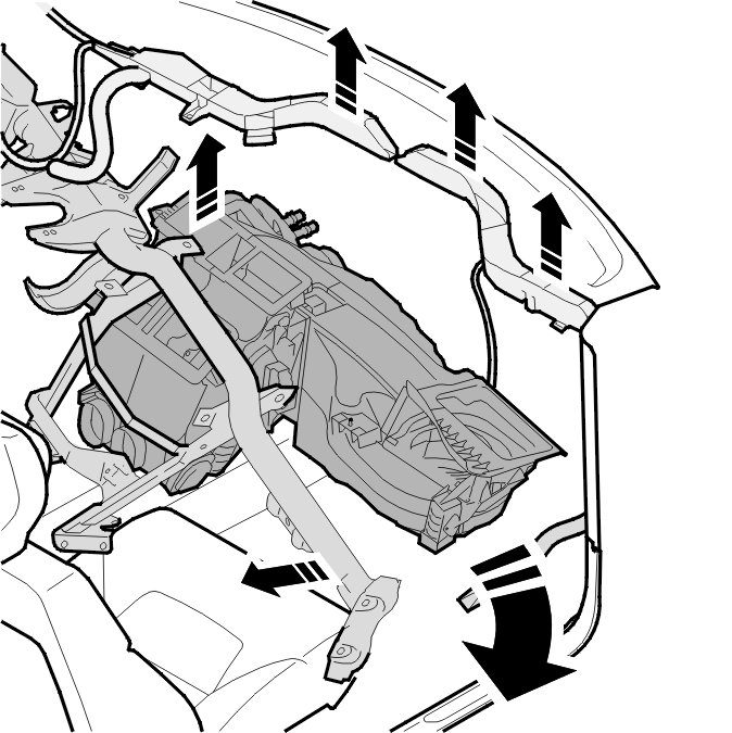 Hold up the member and the cable duct on the passenger side. Remove the climate control unit on the passenger side.