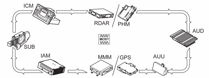 The MOST network uses the master-slave concept. This means that a master control module, infotainment control module (ICM) has overall control of communication on the MOST network.