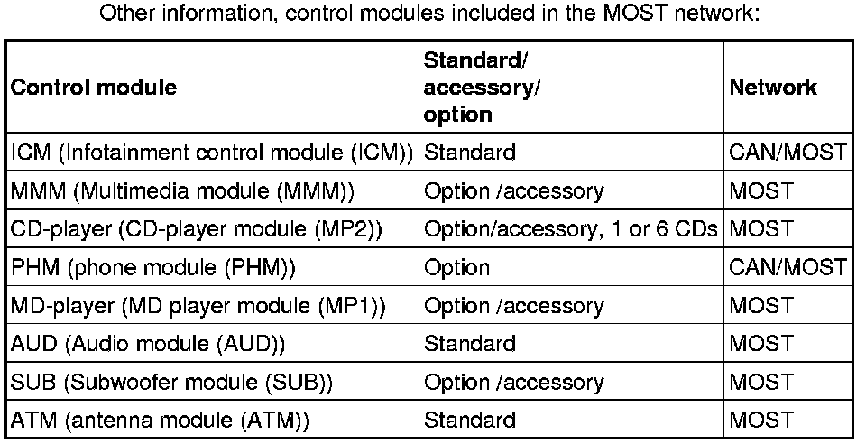 For information about which control modules are included in the MOST network, see the table "Other information, control modules included in the MOST network" below.