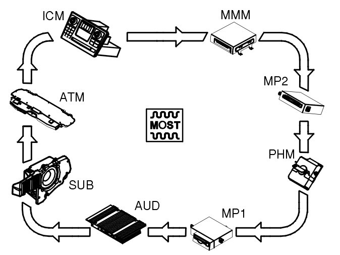 The MOST network is connected in series and the control modules are presented in the order they are connected to each other.