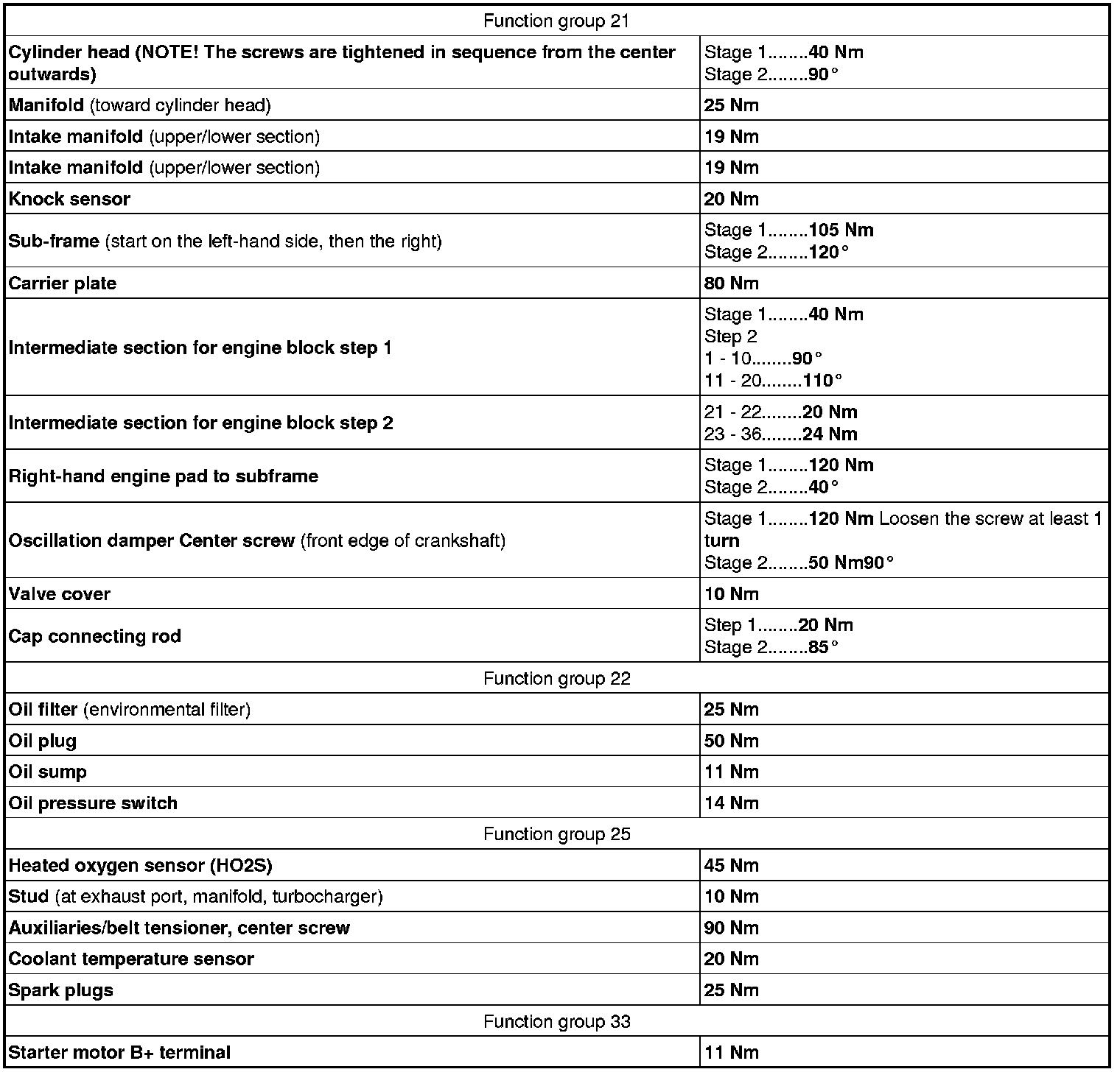 See the table below to find the tightening torques for components not included in the summary.