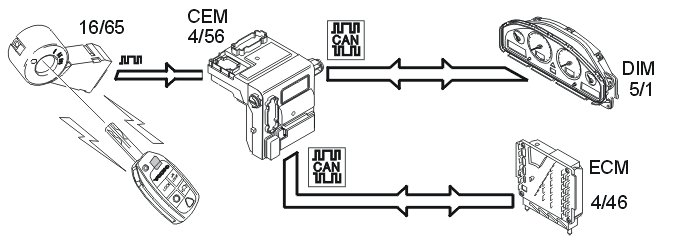 If the ignition key is turned to position 0 but the key is not removed from the ignition switch, the engine control module (ECM) will wait for a while but then send a command to the central electronic module (CEM) to activate the immobilizer, despite the fact that the key has not been removed from the ignition switch.