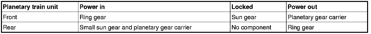 The rear planetary train's ring gear rotates clockwise. Because the rear planetary train's outer planetary gear rotation is added to the rear planetary gear carrier's rotation, the ring gear's speed is greater than the speed at the planetary carrier.