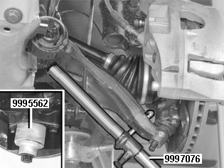 Pull down the link arm. Use: 999 7076 Lever 999 7076 Lever and move the wheel spindle to the side, and install the protective sleeve: 999 5562 PROTECTIVE SOCKET 999 5562 Protective Socket on the ball joint pin at the same time. Keep it in position using the ball joint nut.