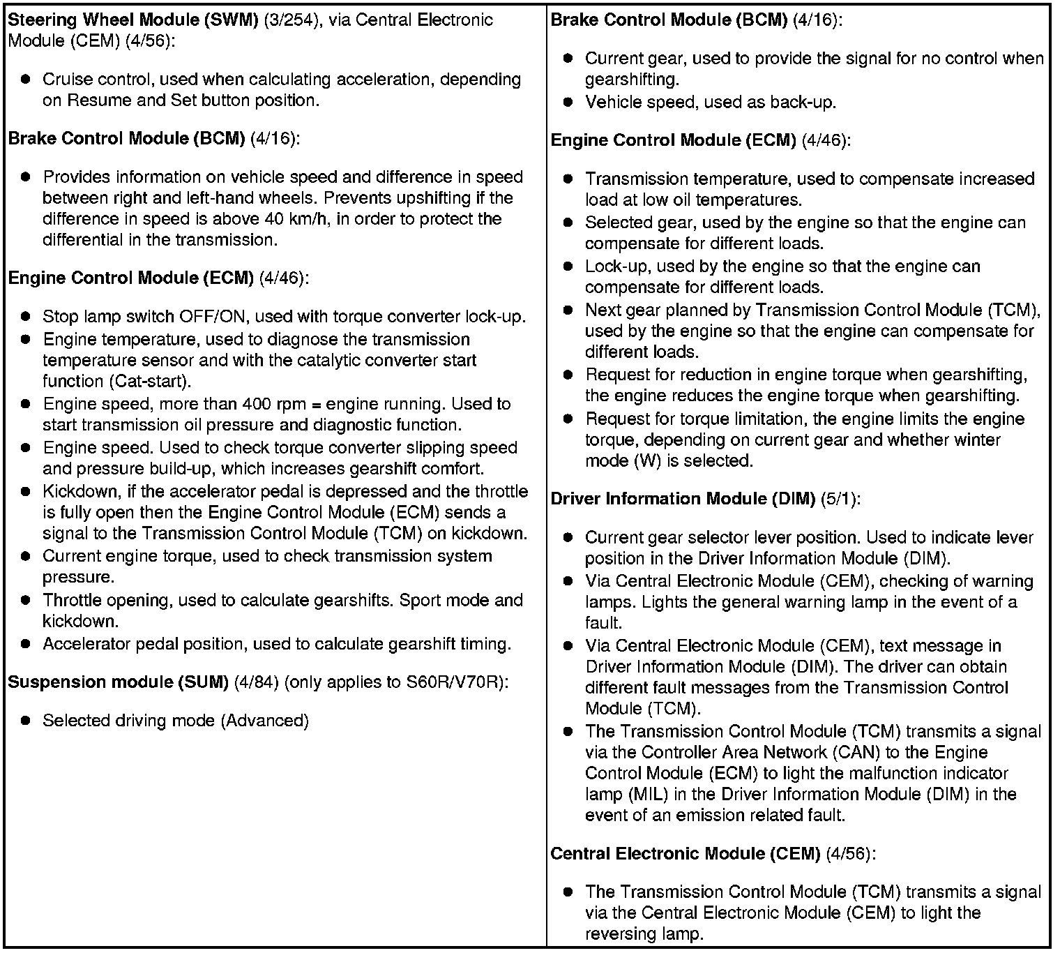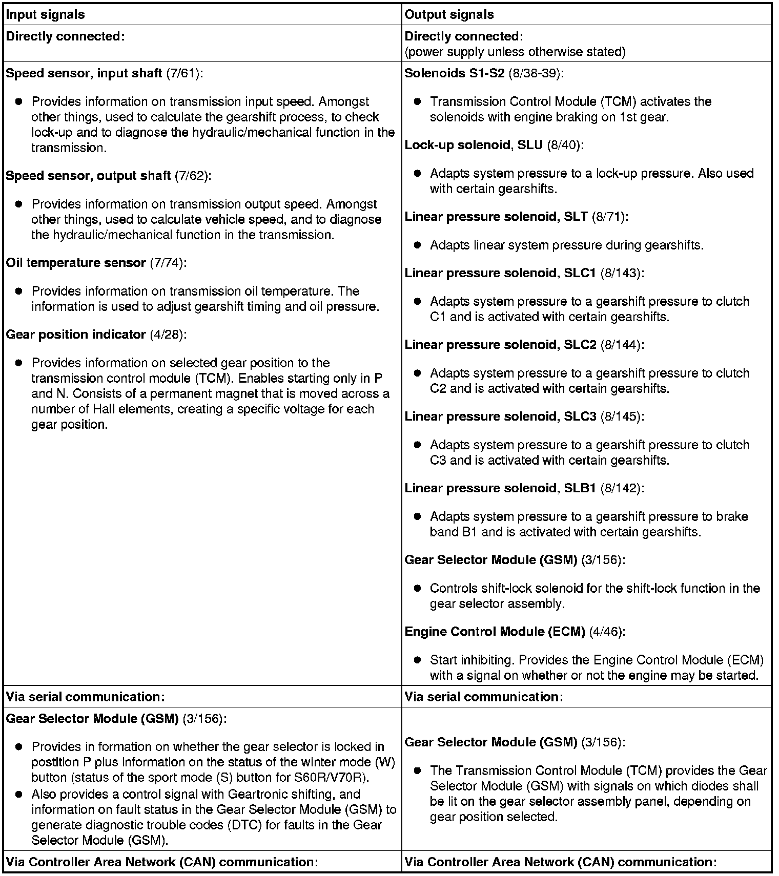The table below summarizes the input and output signals to and from the Transmission Control Module (TCM). The signal types are divided into directly connected signals, serial communication and Controller Area Network (CAN) communication. The illustration below displays the same information with the Volvo component designations.