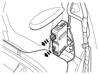 - Position the control module along the rear edge of the rectangular storage compartment in the spare wheel well (dotted line 1).