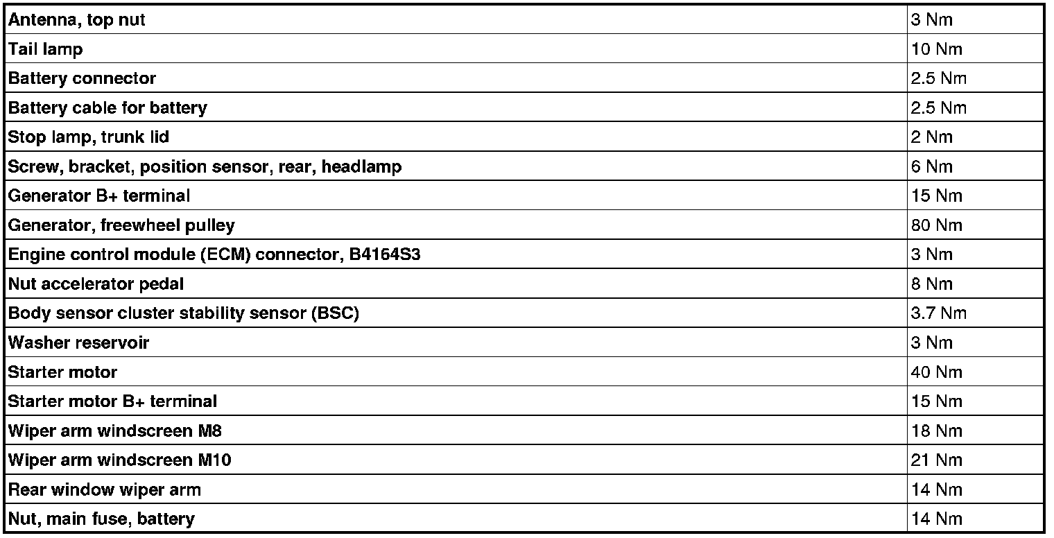 Summary of tightening torques for specific components