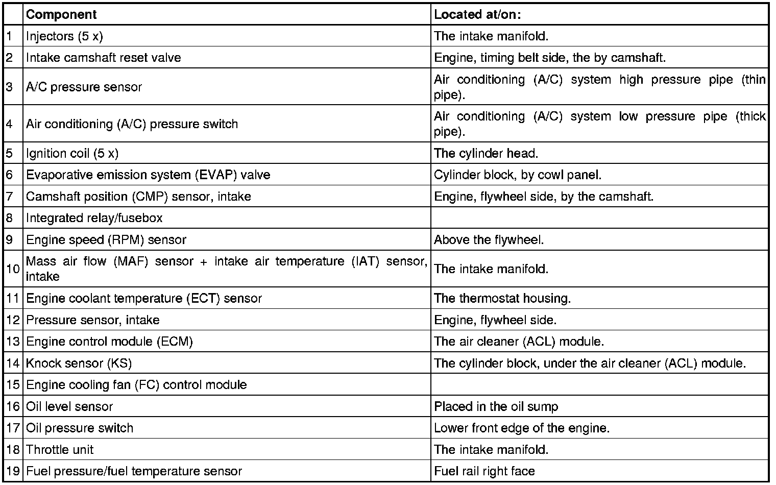 Not all the following components are necessarily in the car. The components vary between engine types.