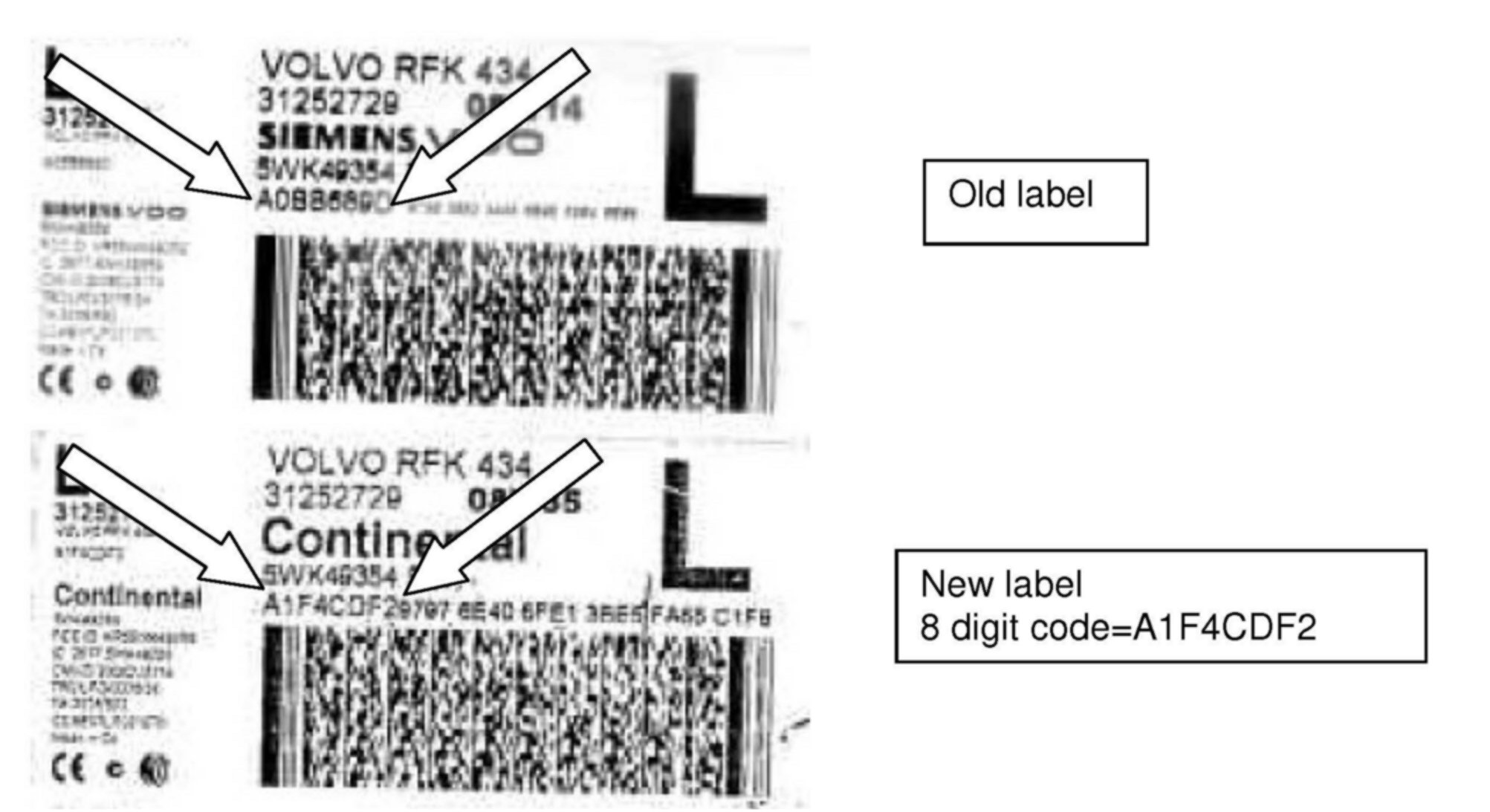 The KIR (key integrated remote) label which is affixed to the spare part packaging has been modified in order to make the 24 digit code more legible. However, as a result of the increased font size, the spacing between the 8 digit and 24 digit codes has been deleted making interpretation of the label more difficult. The label layout remains unchanged, only the font size has been increased to make the 24 digit code more legible.