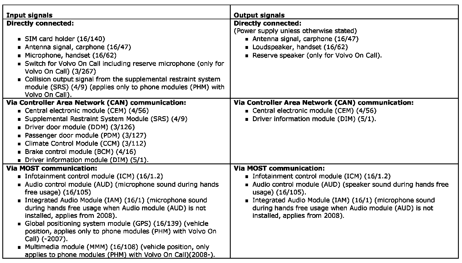 The following table summarizes the input signals to and output signals from the phone module (PHM). The signal types are divided into directly connected signals, MOST and CAN communication. The illustration below displays the same information with the Volvo component designations.