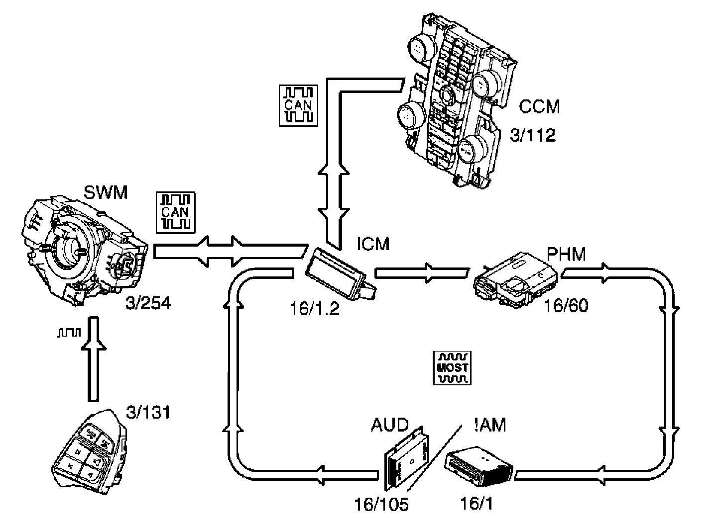 Communication between the phone module (PHM), infotainment control module (ICM) and audio module (AUD)/Integrated Audio Module (IAM) is via the MOST network.