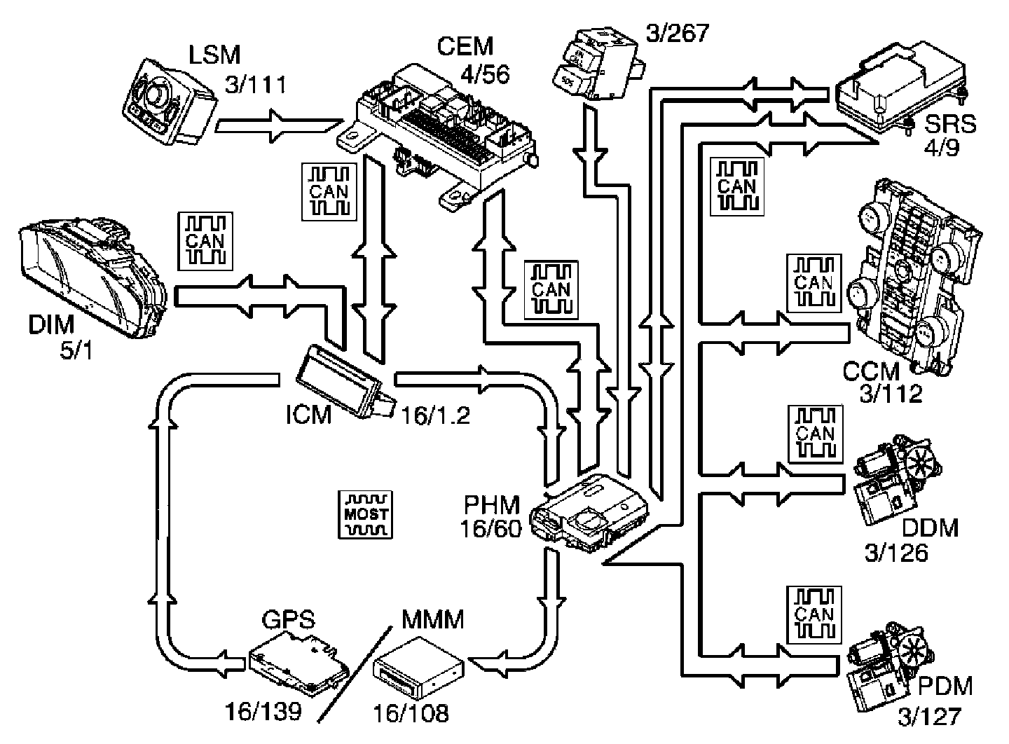 Phone module (PHM) (16/60) does not have its own keypad for menu management. It is controlled either from the keypad on the climate control module (CCM) (3/112) or using the buttons on the steering wheel. The climate control module (CCM) transmits signals for menu management to the infotainment control module (ICM) (16/1.2) via the controller area network (CAN). The infotainment control module (ICM) then sends the signals on to the phone module (PHM) via the MOST network.