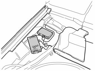 The image shows the location of the control module for the parking assistance camera (PAC), together with the Trailer Module (TRM), under the insulation at the front edge on the left-hand side of the cargo compartment.