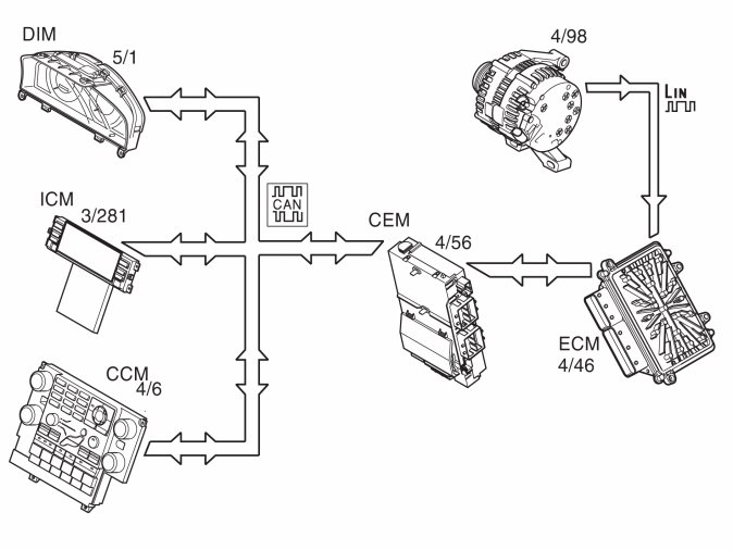 The central electronic module (CEM) (4/56) communicates with the engine control module (ECM) (4/46) via the CAN network. The engine control module (ECM) in turn communicates with the alternator control module (ACM) (4/98) via LIN communication. Thus, the central electronic module (CEM) receives information on how much current is produced by the alternator and how much can be used for various loads in the vehicle.