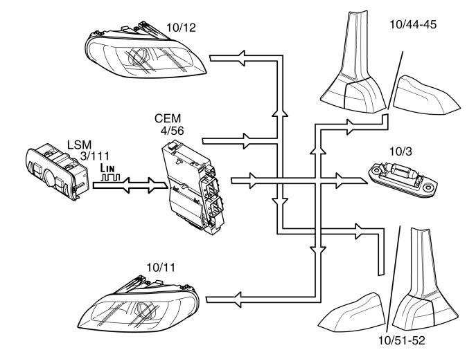 The central electronic module (CEM) (4/56) receives a request to turn on the lamps from the light switch module (LSM) via LIN communication.