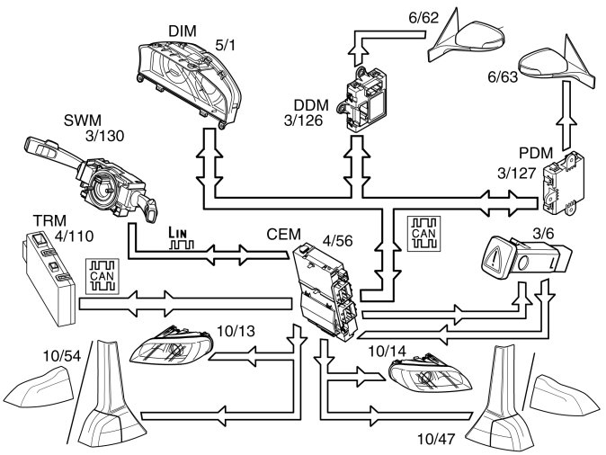 Depending on the position of the knob in the light switch module (LSM) (3/111), the module transmits a request to the central electronic module (CEM) to switch on low beam. Central electronic module (CEM) (4/56) supplies power to the low beam directly via an output.