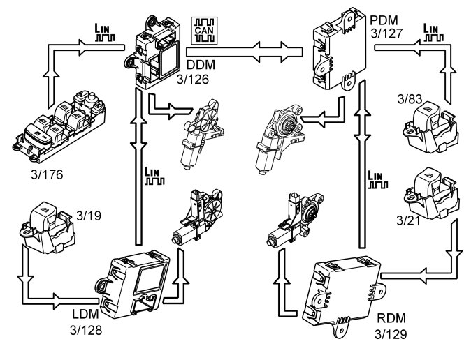 The power window motor on the driver's side is regulated directly by the driver door module (DDM) (3/126). The power window motor on the passenger side is regulated via CAN communication from the driver door module (DDM) to the passenger door module (PDM) (3/127). Signals for operation of the rear driver's side window is sent from the driver door module (DDM) to the rear window via LIN communication. Signals for operation of the rear passenger side window is sent from the driver door module (DDM) to the passenger door module (PDM) via the CAN network and then on to the rear window via LIN communication.