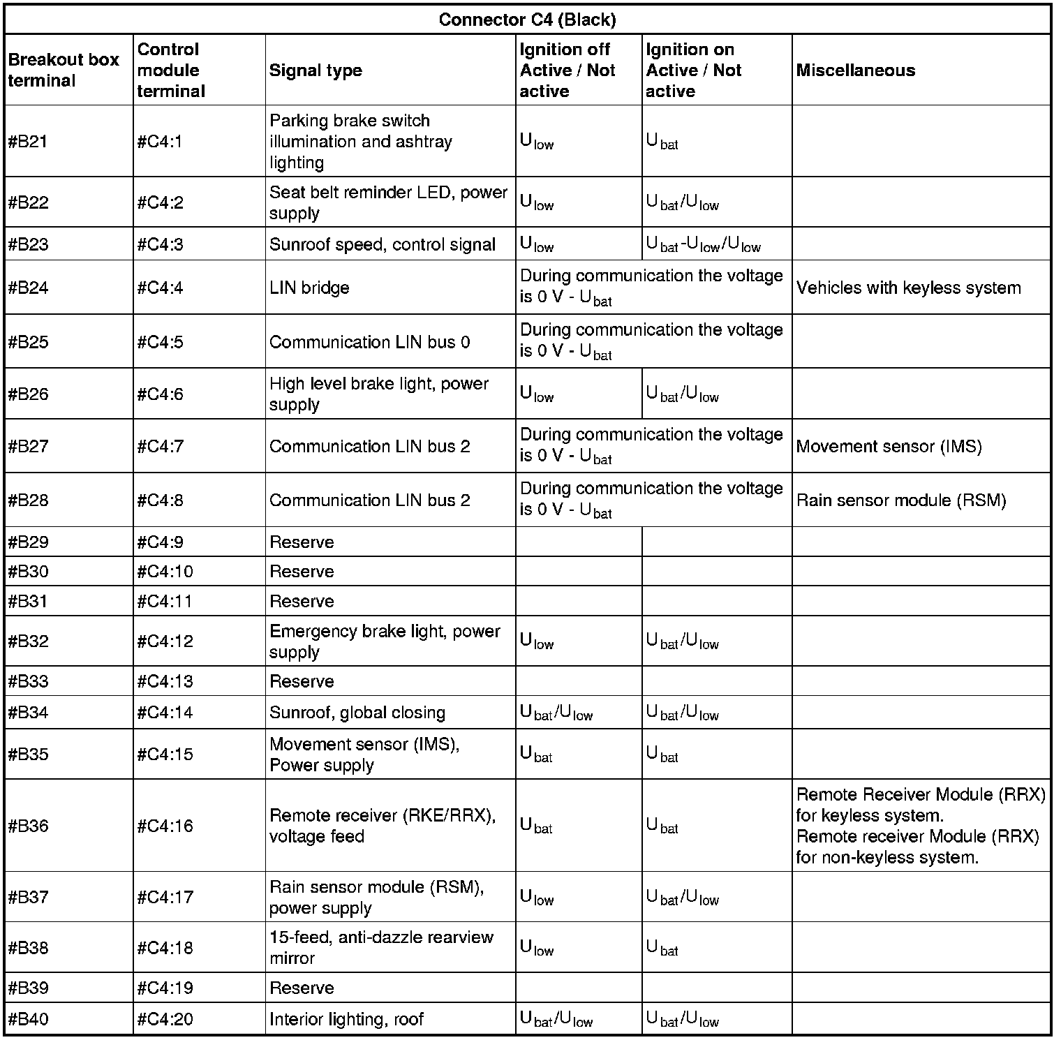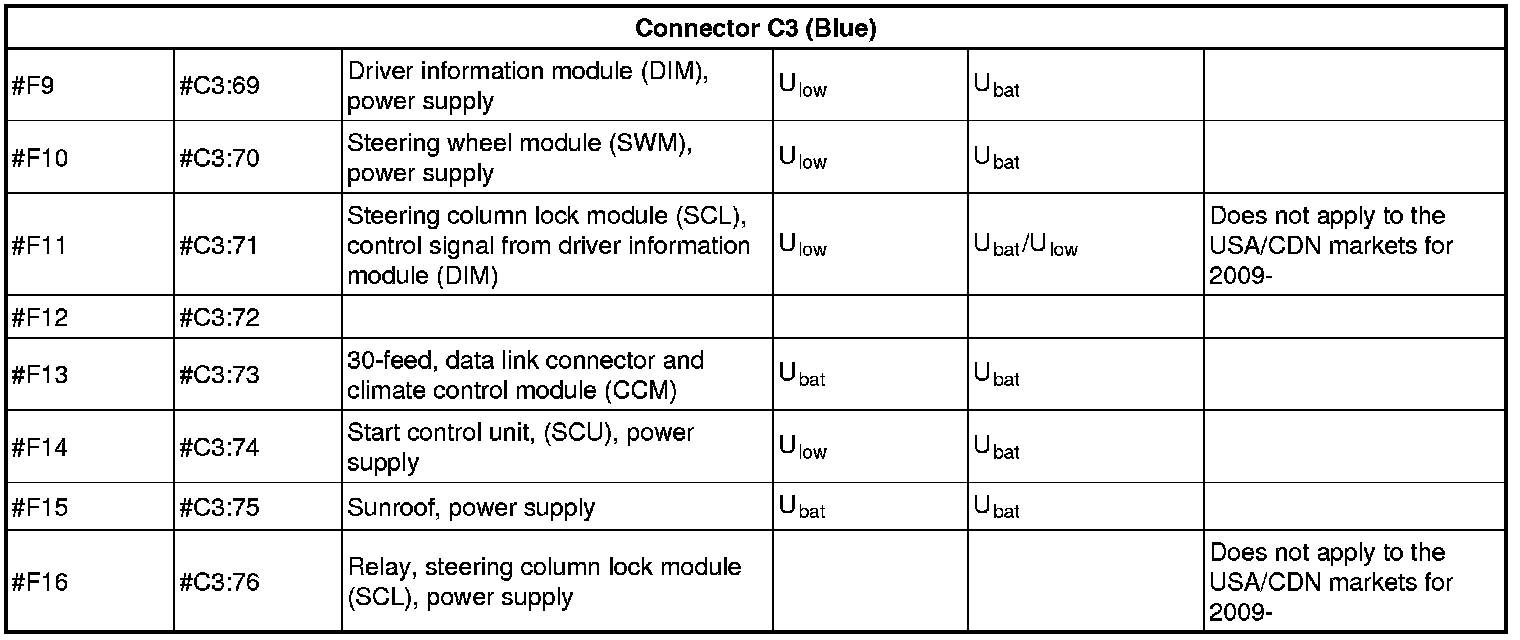 All values given below are between the terminals stated in column 1 and terminal #D5 (power ground). This applies unless otherwise indicated in the last column.