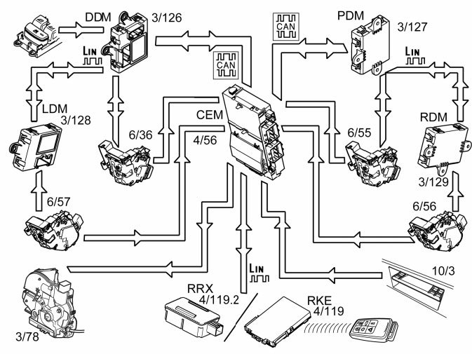 A diagnostic trouble code (DTC) is stored in the central electronic module (CEM) if the indication from the lock motors is incorrect or missing, or if deactivation or activation fails. A message is also shown in the driver information module (DIM).