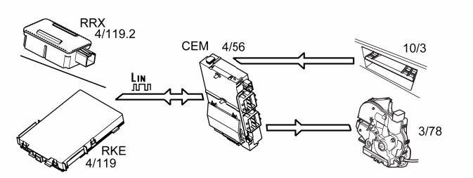 NOTE: The market in Japan has Remote Keyless Entry (RKE) regardless of if the vehicle is equipped with keyless entry system or not. When the vehicle is not equipped with keyless entry system, the Remote Keyless Entry (RKE) communicates directly with Central electronic module (CEM).