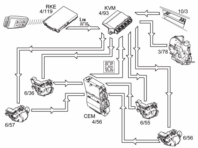 Note! The market in Japan has Remote Keyless Entry (RKE) regardless of if the vehicle is equipped with keyless entry system or not. When the vehicle is not equipped with keyless entry system, the Remote Keyless Entry (RKE) communicates directly with Central electronic module (CEM). If the vehicle is equipped with keyless entry system, the Remote Keyless Entry (RKE) communicates via Keyless Vehicle Module (KVM).