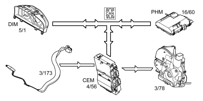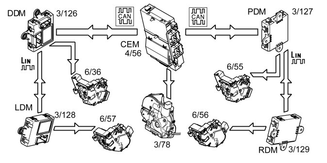 The vehicle is locked using the lock buttons on the door handles. During locking, the antenna is also activated to check that there is an authorized remote key in the vicinity of the vehicle. If the remote key is approved, the keyless vehicle module (KVM) transmits a signal to the central electronic module (CEM) to lock the vehicle.