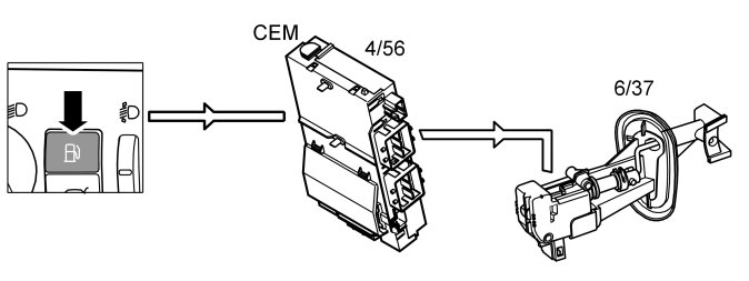 The switch for opening the fuel tank filler cover is in the light switch module (LSM). The light switch module (LSM) is serially connected, via LIN, to the central electronic module (CEM) and transmits a signal to the central electronic module (CEM) when the switch is pressed. The lock motor is directly connected to the central electronic module (CEM).