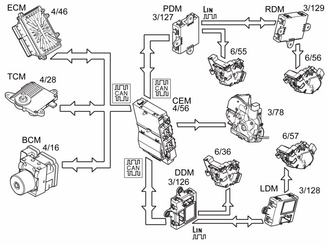 On vehicles with a manual transmission, the Central electronic module (CEM) receives information about the vehicle's speed from the Brake control module (BCM). At the same time the accelerator pedal must be partially affected in order for locking to be carried out.