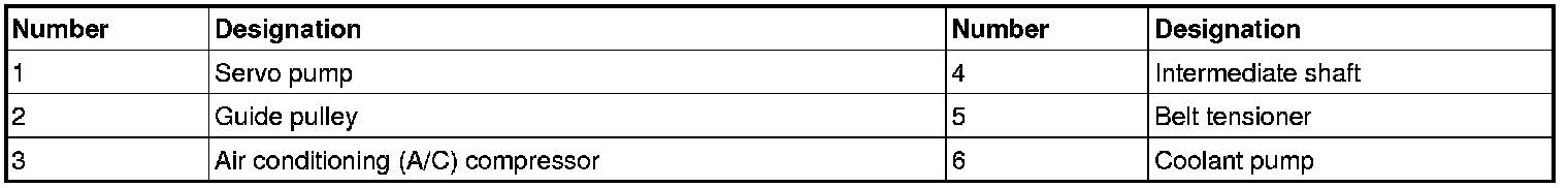 The belt system consists of a 6-ribbed Poly-V belt, an automatic belt tensioner and a guide pulley. This system drives the servo pump and AC compressor. The coolant pump is driven by the servo pump via the clutch system.