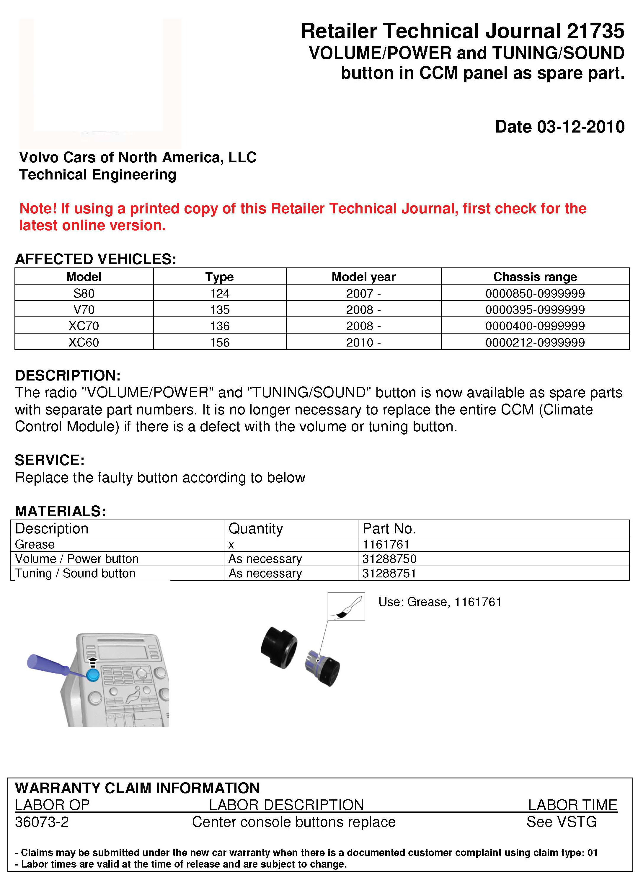 The radio "VOLUME/POWER" and "TUNING/SOUND" button is now available as spare parts with separate part numbers. It is no longer necessary to replace the entire CCM (Climate Control Module) if there is a defect with the volume or tuning button.