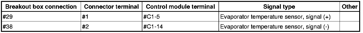 Passenger compartment temperature sensor: Resistance between terminals #30 and #38 on the breakout box should be approx. 11.99 k ohms at +20 °C. Resistance decreases as temperature increases.