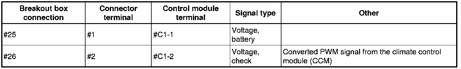 The fan motor is supplied by a PWM signal from the climate control module (CCM) via the fan's control module. The control module ensures that the fan motor receives the correct voltage in reference to battery voltage and that the fan thereby obtains the desired speed.