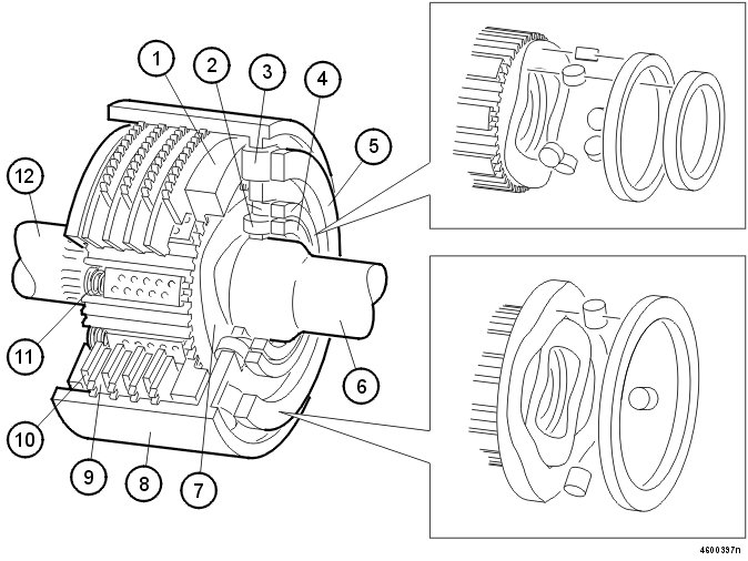 The sinusoidal cam disc with its sinusoidal curve rotates at the same speed as the propeller shaft. The annular piston rollers act on the cam disc's cam curve and press the annular pistons in and out. This creates an oil flow. The oil flow is controlled by the control valve/axial solenoid to create an oil pressure. The oil pressure affects the operating pistons that are applied against the multi-plate clutch pack.