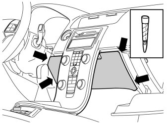 - Carefully pry off the panel inside the centre console. Use a plastic weatherstrip tool. The panel is secured by two clips on each of the short sides.
