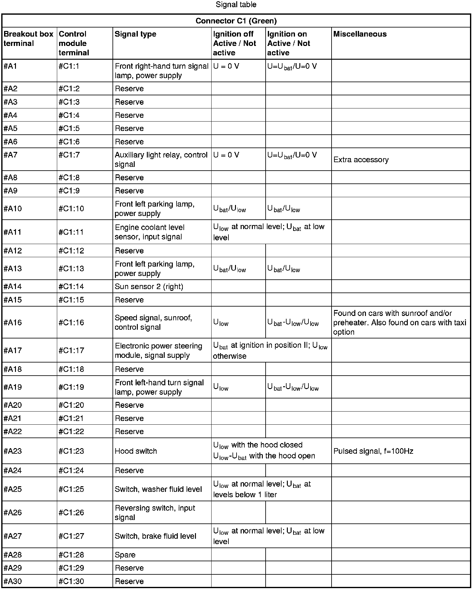 All values given below are between the terminals stated in column 1 and terminal #D5 (power ground). This applies unless otherwise indicated in the last column.