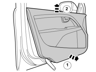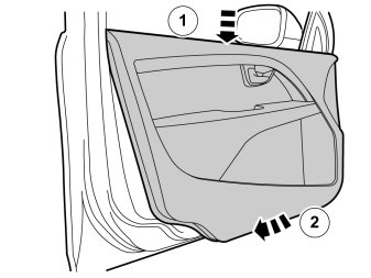 Two of the rivets (1) end up at the bottom on the door, the last rivet (2) ends up inside the console. To prevent rivet remains from rattling inside the door, carry out the following: