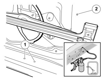 - Spray thin rustproofing agent through the drain holes at the bottom of the door to keep the rivet remains in place. Use low viscosity rustproofing agent and apply with tool 9814075. Ensure to coat the entire door bottom.