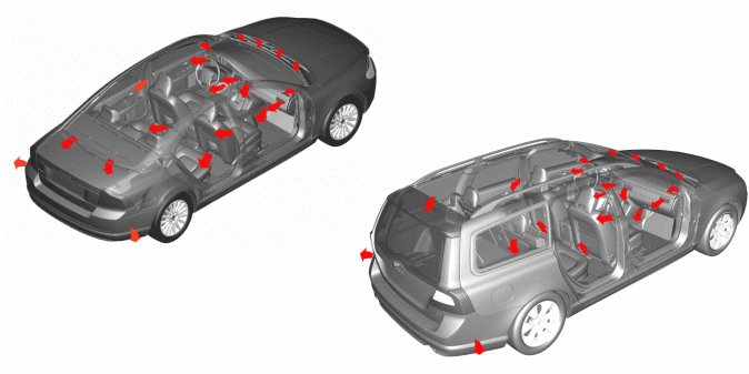Two of the floor outlets are placed in the centre under the sound wall, under the steering on the driver's side and in the centre under the glove compartment on the passenger's side. The other two are positioned under each seat and directed backward.