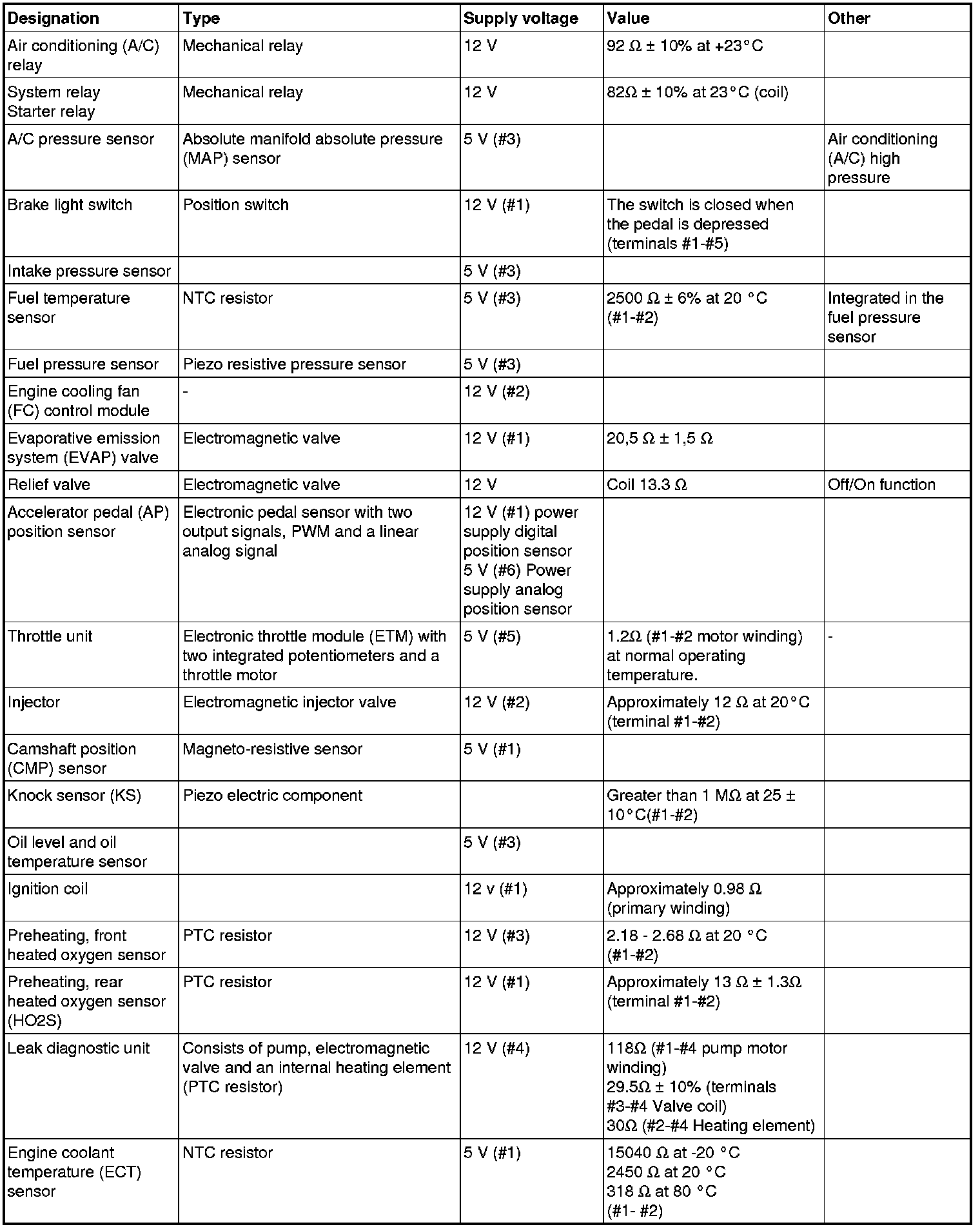 The component specification gives the value of the component when the connector is disconnected. Where no value is given, it is not possible to measure a relevant value at the component.