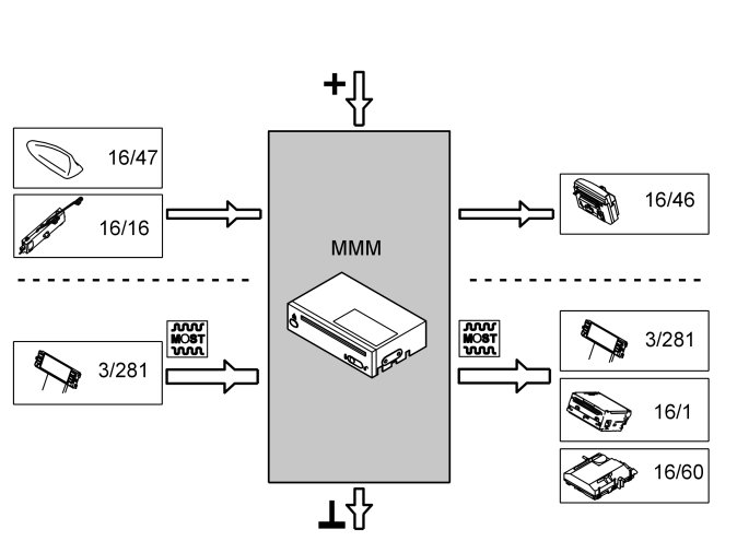 The multimedia module (MMM) communicates with other control modules via the MOST network.