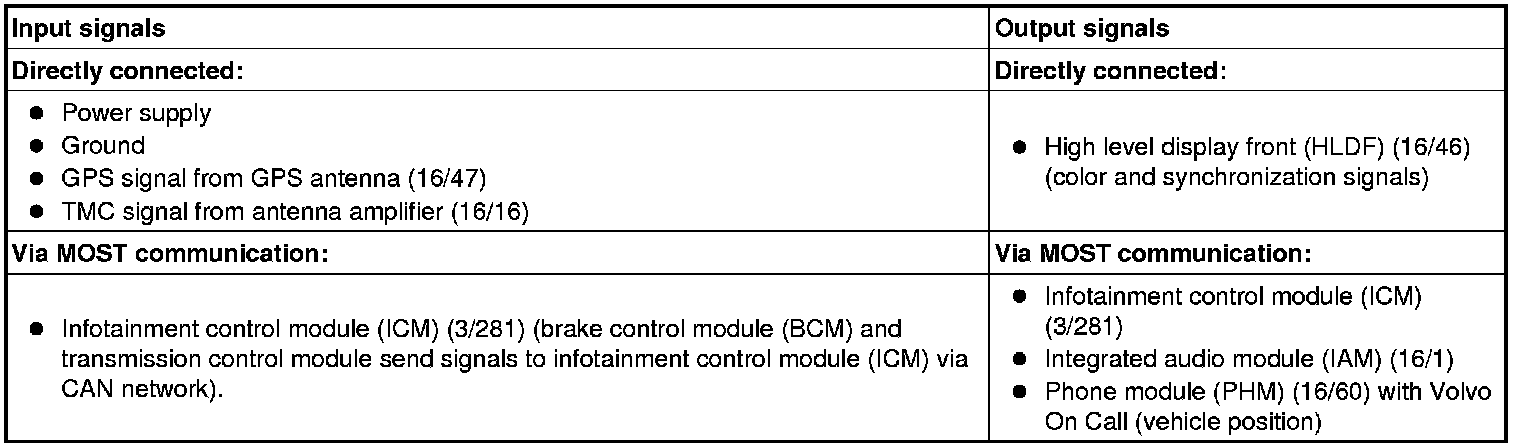 The table below summarizes the input signals to and output signals from the multimedia module (MMM). The signal types are divided into directly connected signals and MOST communication. The illustration below depicts the same information with the Volvo component designations.