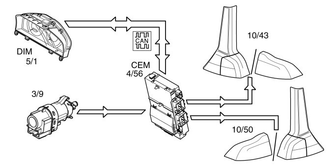 This function is controlled by the left control stalk. The steering wheel module (SWM) (3/130) sends signals to the central electronic module (CEM) (4/56) via LIN communication to activate the turn signals (10/13-14 and 10/47-54).
