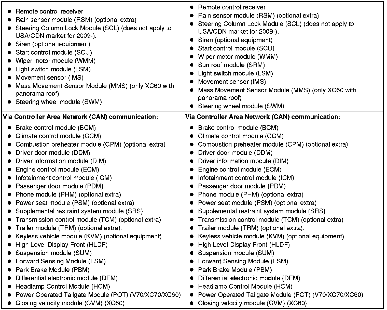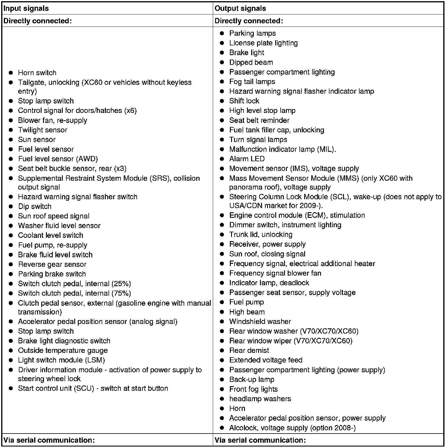 The table below summarizes the input signals to and output signals from the central electronic module (CEM). The signal types are divided into directly connected signals, serial communication and controller area network (CAN) communication.